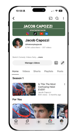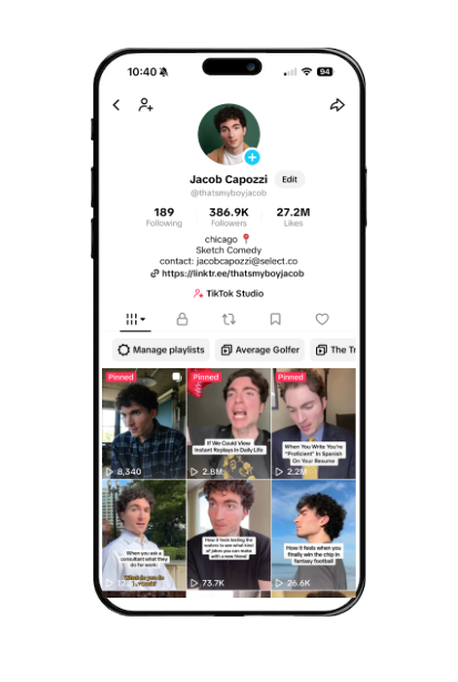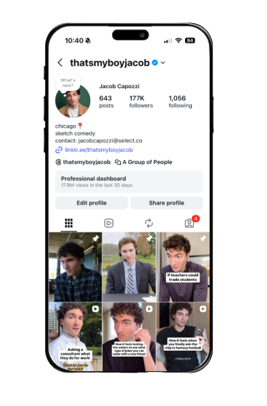 Jacob Capozzi is an actor, writer, and comedic content creator whose journey started in 2019. While bunkered down with his family in Chicago and looking to scratch his creative itch, he turned to TikTok—filming myself in the backyard and around the house, talking to a wall or tree as the other character in each skit. This was to the amusement (and likely concern) of his neighbors and family who watched. From that moment, his online comedy sketch platform, That’s My Boy Jacob, was born.